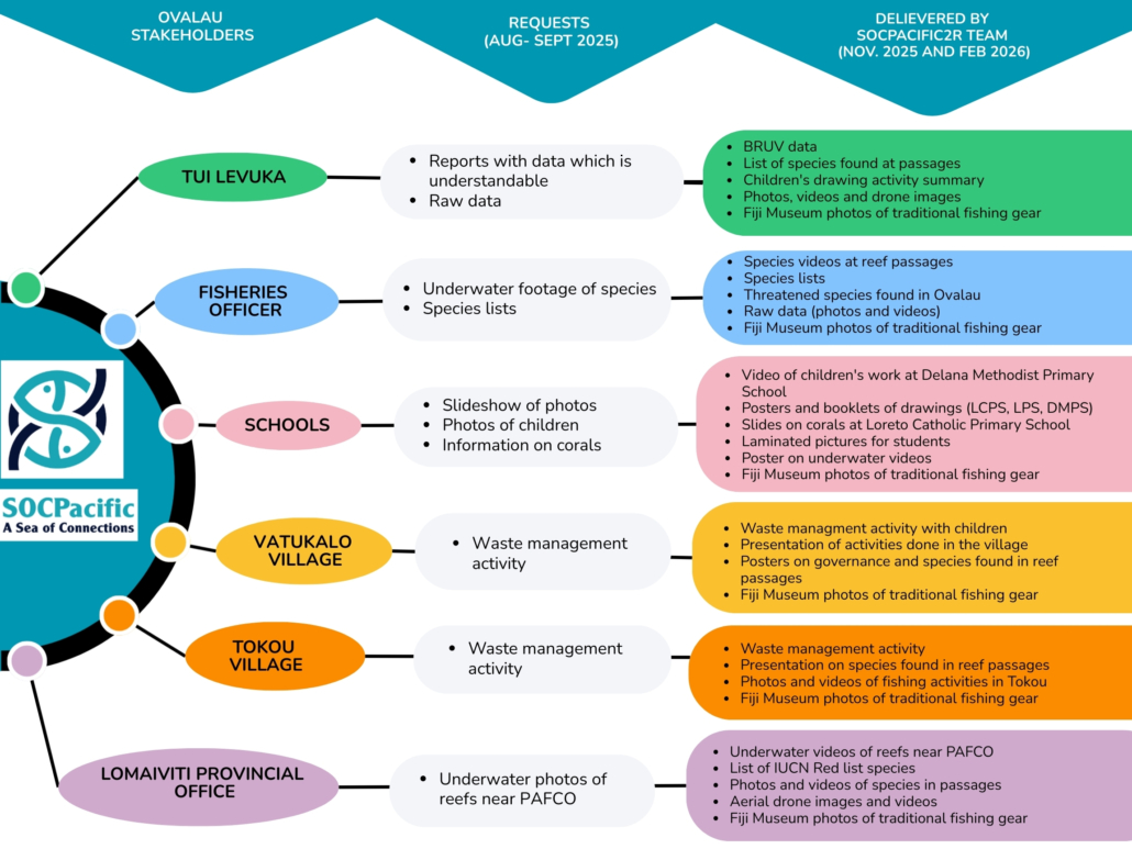 Reporting back to stakeholders with what they requested is an important step to co-creation of knowledge for resource management. Upon request from the knowledge holders of Ovalau Island in Fiji, our SOCPacific2R team delivered co-created data after each fieldwork period. Knowledge shared by the people from Vatukalo and Tokou villages, students from three schools and other stakeholders in Levuka was returned during two reporting back phases of the team: in November 2025 and in February 2026. This reporting process signifies that in our research work aiming to explore reef passages, we also recognize, respect and engage with knowledge holders on Ovalau. A summary of the kind of information or data requested and delivered is provided below, highlighting what was produced and given back to the stakeholders.